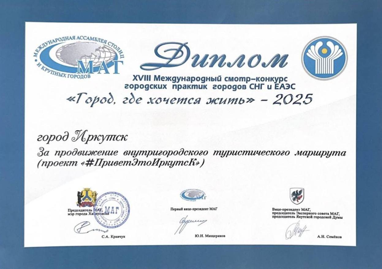 Проект администрации столицы Прибайкалья и информационно-туристской службы «Привет! Это Иркутск!» получил награду в номинации «За продвижение внутригородского туристического маршрута». В конкурсе принимали участие 30 крупных городов России и стран, входящих в Содружество Независимых Государств и Евразийский экономический союз. Они представили более 160 проектов, которые комиссия оценила по ряду критериев: качество и результативность организационных и технических решений, полученный социальный и экономический эффект, возможность тиражирования практики в других муниципалитетах. Проект Команды Счастья администрации областного центра «Привет! Это Иркутск!» – это цикл из 32 коротких серий о знаковых местах города, которые расположены на туристическом маршруте «Зеленая линия». В видеороликах экскурсоводами выступали известные иркутяне, которые увлекательно рассказывали о каждом объекте: музеях, исторических зданиях, храмах и других достопримечательностях. Сериал выходил каждое утро в течение месяца в социальных сетях мэрии и набрал более 700 тысяч просмотров, сообщает пресс-служба городской администрации. «Спасибо каждому, кто участвовал в съемках, кто смотрел и делился видеороликами в соцсетях. Мы хотели, чтобы иркутяне по-новому взглянули на привычные места, и нам это удалось. Кроме того, сериал посмотрели жители разных уголков России и даже других стран. Некоторые из них вдохновились нашей идеей и сняли похожие видео о своей малой Родине, – отметила советник мэра Инга Корочкина. – Рады, что наша практика оценена как одна из лучших. Будем продолжать делать столицу Прибайкалья городом, где хочется жить и который интересно открывать снова и снова». Она рассказала, что уже началась подготовка к съемкам третьего сезона. Он будет называться «Привет! Это Иркутск – 365».